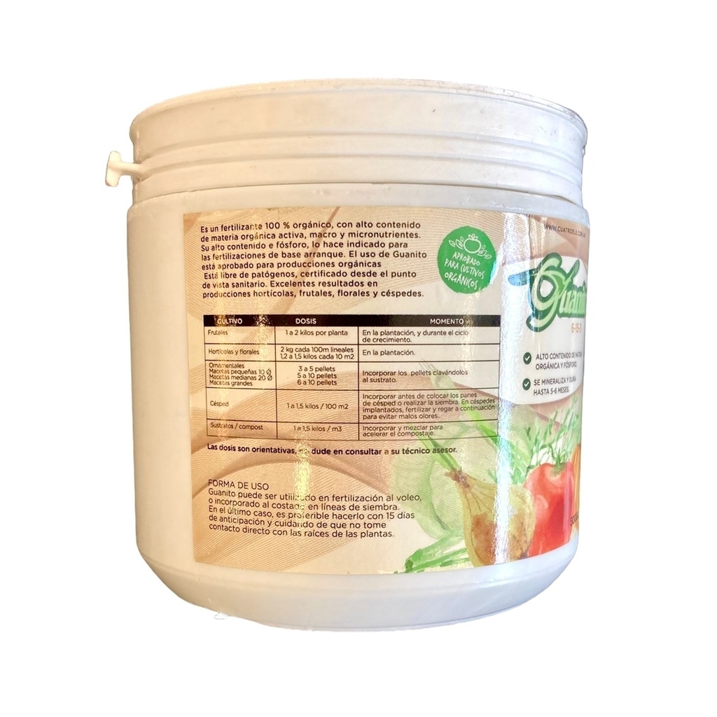 GUANITO es un fertilizante 100% orgánico con alto contenido de materia orgánica activa y con macro y micro nutrientes. Su alto contenido de fósforo lo hace indicado para las fertilizaciones de base o arranque para promover el desarrollo radicular. Conviene mezclarlo con el suelo unos 7 días previos a la siembra o trasplante. El uso de GUANITO está aprobado para producciones orgánicas. Está libre de patógenos, certificado desde el punto de vista sanitario Excelentes resultados en producciones hortícolas, frutales, florales y céspedes.